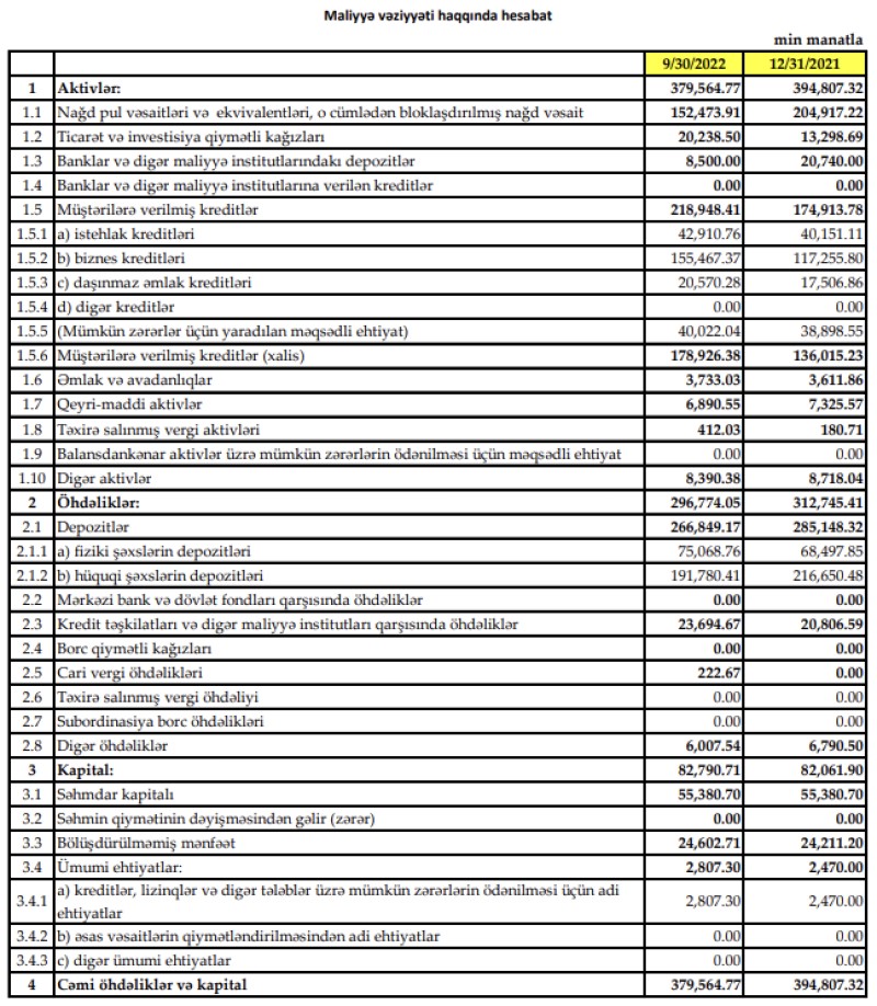 2022-ci ilin 9 ayı ərzində “Yapı Kredi Bank Azərbaycan”ın biznes kreditləri portfeli 38 milyon 212 min manat artaraq 155 milyon 467 min manata, istehlak kreditləri portfeli 2 milyon 760 min manat artaraq 42 milyon 911 min manata, ipoteka kreditləri portfeli isə 3 milyon 64 min manat artataq 20 milyon 570 min manta çatıb.