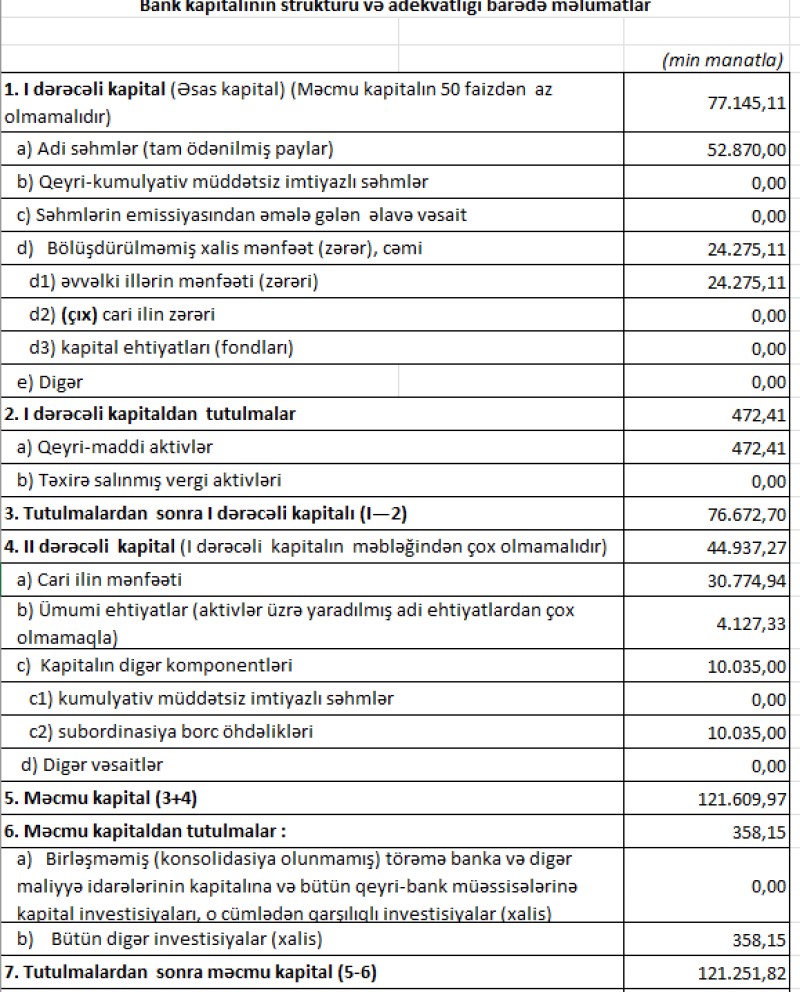 30 Sentyabr 2022-ci il tarixində "Bank of Baku" 121 milyon 252 min manat məcmu kapitala malik olub (31 Dekabr 2021-ci il tarixində 102 milyon 854 min manat idi). Bankın məcmu kapitalı minimal tələbdən (50 milyon manat) 2,4 dəfə çoxdur.