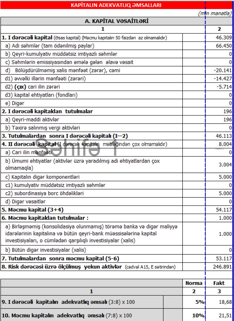 Hesabat dövrünə bankın məcmu kapitalı 53 milyon 67.07 min manat təşkil edir. Bankın ani likvidlik əmsalı 110.55% təşkil edir ki, bu da AMB-nin tələb etdiyi min normadan 3 dəfədən çoxdur.