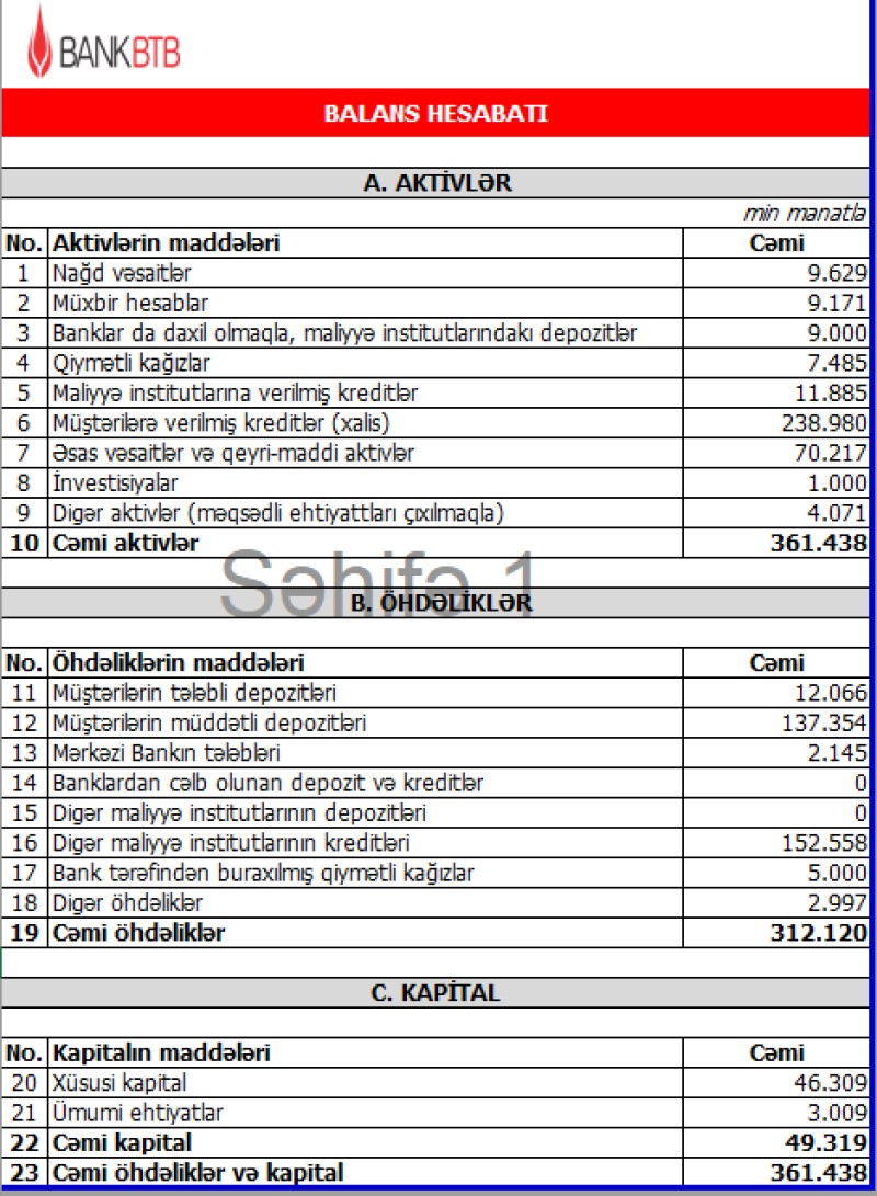 Press-relizdə qeyd edilib ki, hesabat tarixinə cəmi aktivlər 361 milyon 438.35 min manat təşkil etmişdir. Bu isə ötən rüblə müqayisədə 2% artım deməkdir.