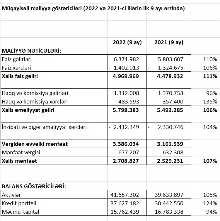 "Embafinans" 2022-ci ilin 9 ayı üzrə maliyə göstəricilərini açıqlayıb.Bank Olmayan Kredit Təşkilatı "Embafinans" QSC 2022-ci lin 9 ayını (yanvar-sentyabr) 2 milyon 709 min manat xalis mənfəət ilə başa vurub."Embafinans"ın xalis mənfəəti 2022-ci lin 9 ayında 2021-ci ilin 9 ayı ilə müqayisədə 7% artıb. Kredit təşkilatı ötən ilin yanvar-sentyabr dövrünü 2 milyon 529 min manat xalis mənfəət ilə bağlamışdı.