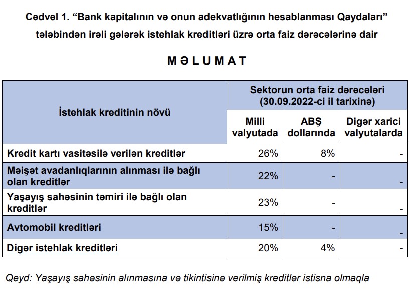 Marja.az xəbər verir ki, 30.09.2022-ci il tarixinə, milli valyutada, orta faiz dərəcəsi "Kredit kartı vasitəsilə verilən kreditlər" üzrə 26%, "Məişət avadanlıqlarının alınması ilə bağlı olan kreditlər" üzrə 22%, "Yaşayış sahəsinin təmiri ilə bağlı olan kreditlər" üzrə 23%, "Avtomobil kreditləri" üzrə 15%, "Digər istehlak kreditləri" üzrə 20% təşkil edib.