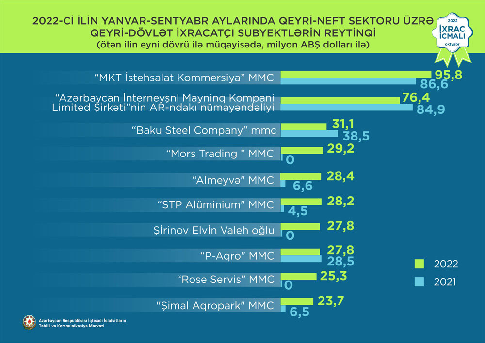 2022-ci ilin yanvar-sentyabr ayları üzrə hazırlanan qeyri-dövlət ixracatçı subyektlərin reytinqində ilk onluqda aşağıdakı şirkətlər təmsil olunurlar: