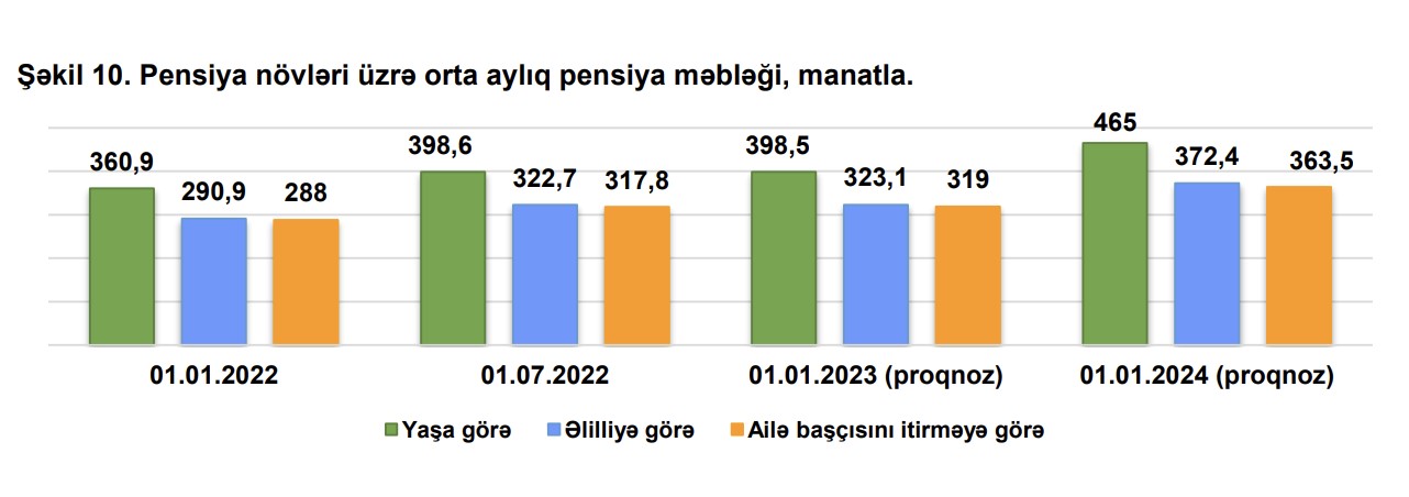 Gələn il pensiya növləri üzrə orta aylıq pensiya məbləğinin - yaşa görə pensiya üzrə 398,5 manata, əlilliyə görə pensiya üzrə 323,1 manata, ailə başçısını itirməyə görə pensiya üzrə 319 manata çatacağı proqnozlaşdırılır.