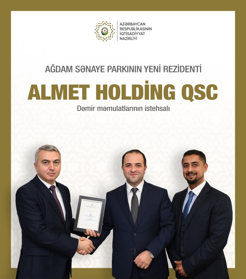 Daha bir yeni rezident “Almet Holding” Qapalı Səhmdar Cəmiyyəti Sənaye Parkının 1 hektar ərazisində “Müxtəlif növ dəmir məmulatlarının istehsalı” layihəsini həyata keçirəcək. Layihə çərçivəsində polad həsir, mismar, bolt, məftil, eləcə də sinkli məftil istehsal ediləcək.