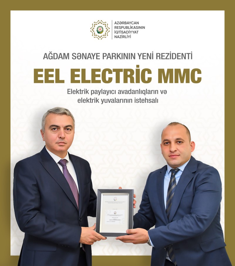 Sənaye Parkının yeni rezidenti “Eel Electric” MMC “Elektrik paylayıcı avadanlıqların və elektrik yuvalarının istehsalı” layihəsi icra edəcək. Layihə çərçivəsində 10 və 35 kV-luq elektrik yuvalarının, eləcə də 0,4 kV-luq elektrik paylayıcı qurğu və idarəetmə lövhələrinin istehsalı planlaşdırılır. İnvestisiya dəyəri 1,4 milyon manat olan müəssisədə 30 nəfər daimi işlə təmin ediləcək.