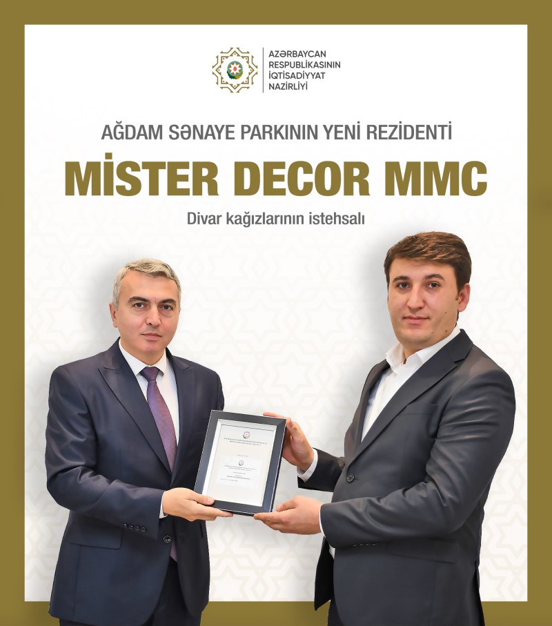 Ağdam Sənaye Parkının digər yeni rezidenti “Mister Decor” Məhdud Məsuliyyətli Cəmiyyəti tərəfindən Sənaye Parkının 1 hektarında divar kağızlarını istehsal edəcək müəssisə inşa olunacaq.