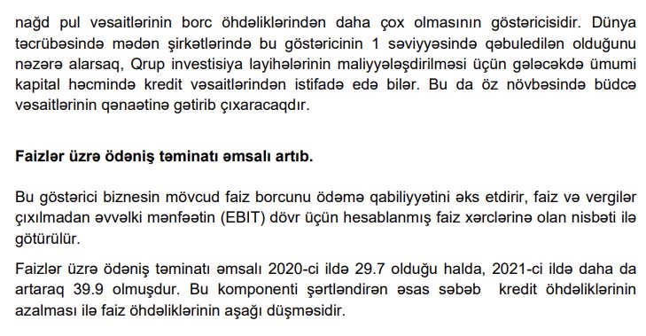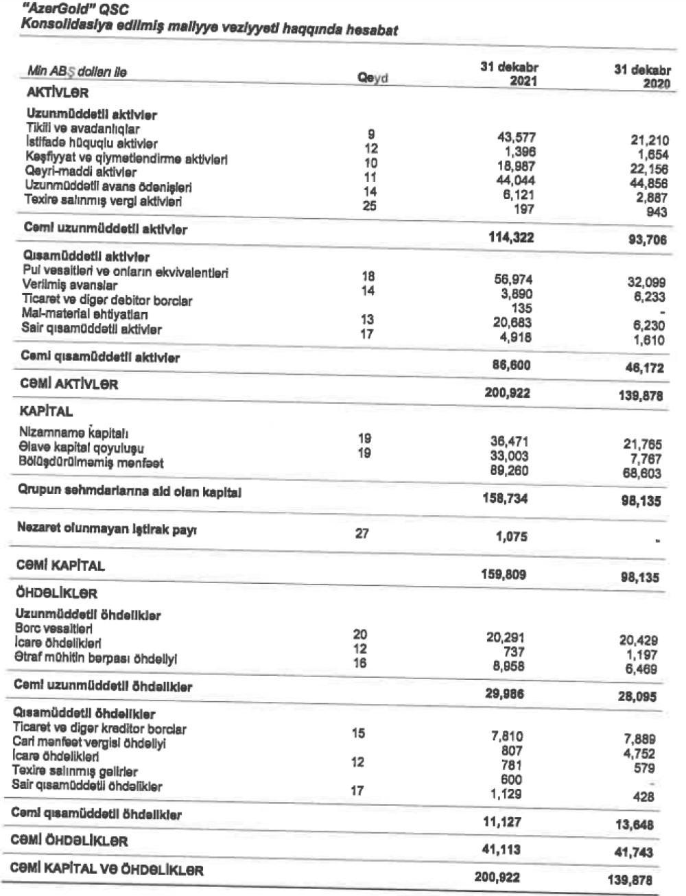 Konsolidə edilmiş hesabata görə, ötən il "AzerGold" qrupunun ("AzerBlast" MMC və "Daşkəsən Dəmir Filiz" MMC daxil) xalis mənfəəti isə 29 milyon 402 min ABŞ dolları təşkil edib. Bu, 2020-ci illə müqayisədə 39% və ya 18 milyon 808 min ABŞ dolları azdır. Qrup 2020-ci ili 48 milyon 210 min dollar xalis mənfəət ilə bağlamışdı.