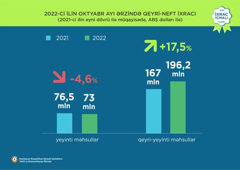 2022-ci ilin oktyabr ayı üzrə ixrac 5,2 milyard ABŞ dolları, qeyri-neft sektoru üzrə ixrac isə 269,1 milyon ABŞ dolları təşkil edib. 2022-ci ilin oktyabr ayı ərzində yeyinti məhsulları üzrə ixrac 73 milyon ABŞ dolları, qeyri-yeyinti məhsulları üzrə isə 17,5% artaraq 196,2 milyon ABŞ dollarına bərabər olub.