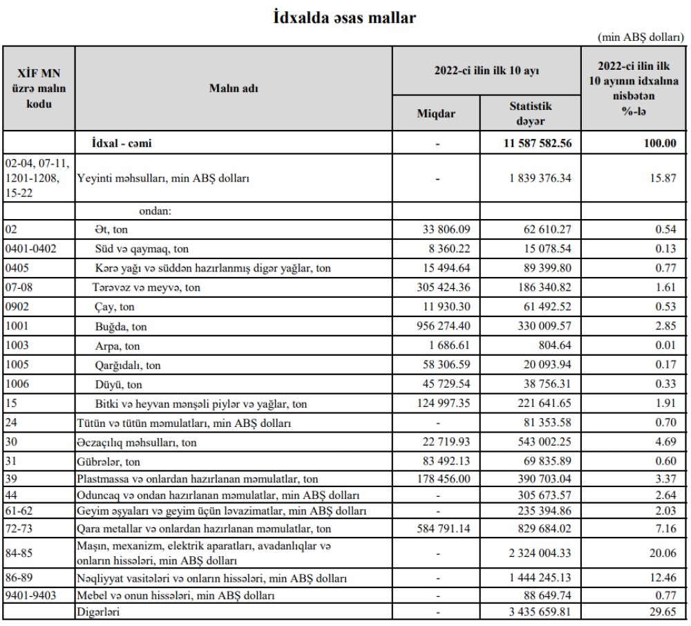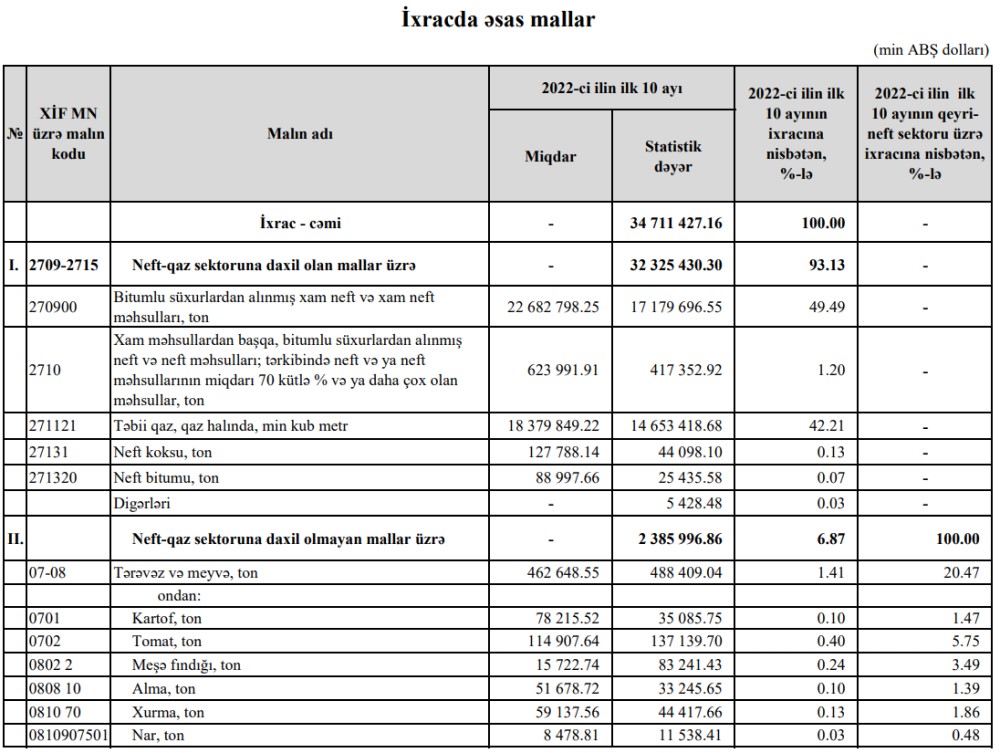 2022-ci ilin 10 ayı ərzində (yanvar-oktyabr) Azərbaycanın ən çox ixrac və idxal etdiyi mallar.