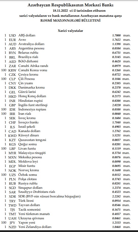Dolların bazar ertəsi üçün rəsmi məzənnəsi müəyyən olunub