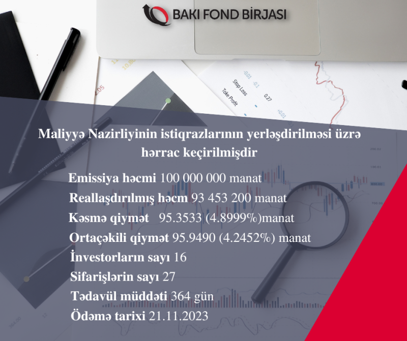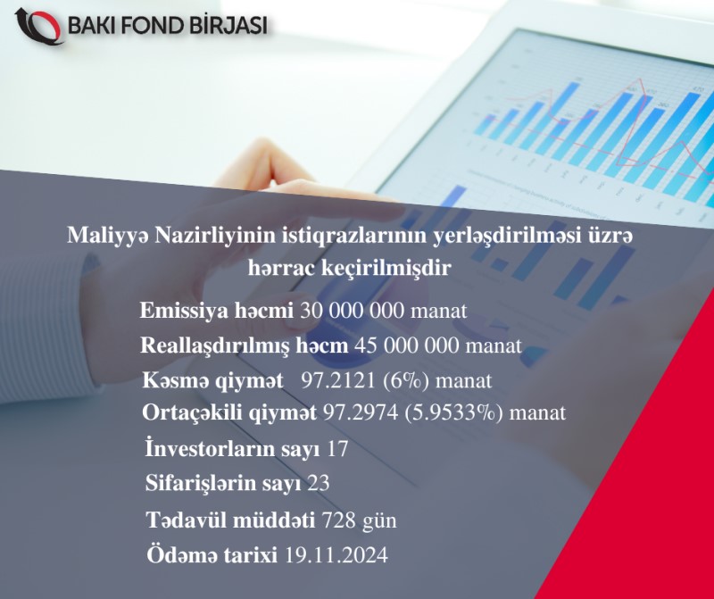 Həmçinin, 22 noyabr 2022-ci il tarixində Bakı Fond Birjasında Azərbaycan Respublikası Maliyyə Nazirliyinin AZ0105032947 ISIN-li, 30 milyon manat həcmində, 728 gün tədavül müddətli dövlət ortamüddətli istiqrazlarının (DOİ) yerləşdirilməsi üzrə hərrac keçirilib.