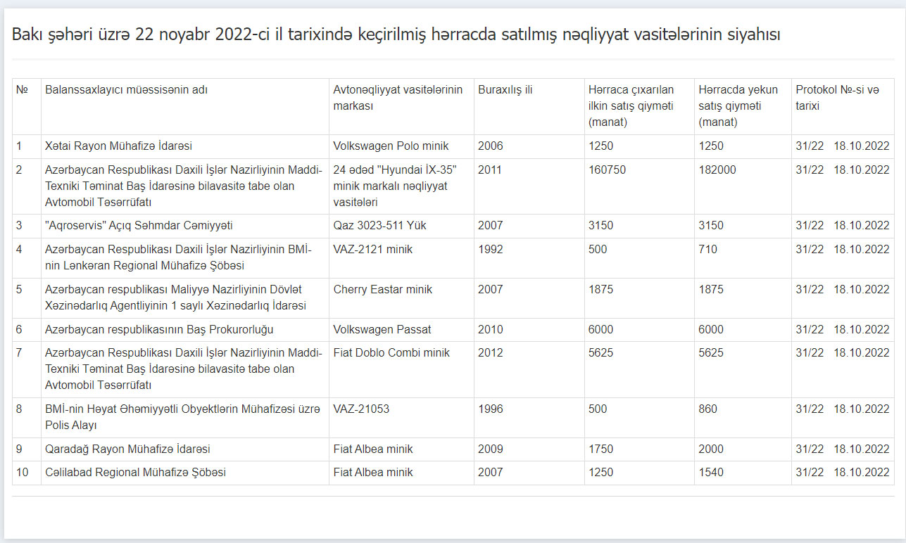 Noyabrın 22-də keçirilən hərracda 33 avtomobil satılıbİqtisadiyyat Nazirliyi yanında Əmlak Məsələləri Dövlət Xidməti tərəfindən noyabrın 22-də keçirilən hərracda 33 nəqliyyat vasitəsi satılıb.