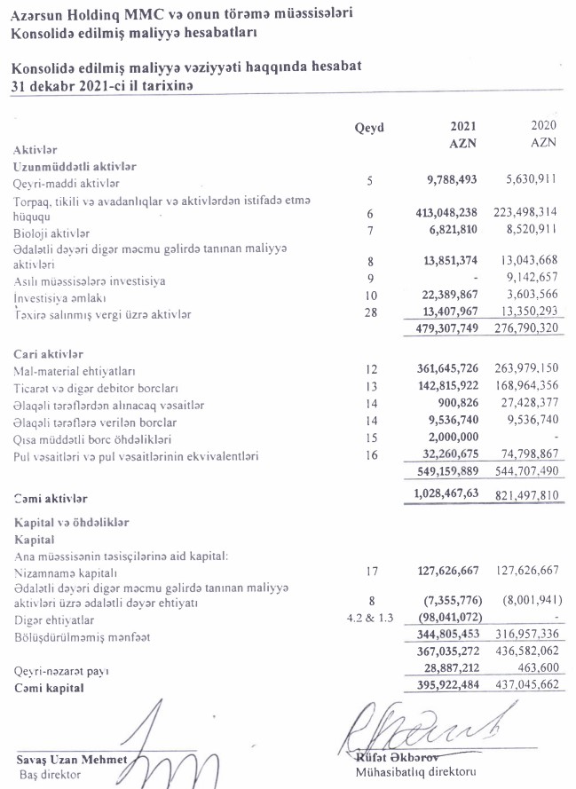 Ötən il “Azərsun Holdinq” qrupunun cəmi aktivləri 207 milyon manat və ya 25,2% aratraq 31 Dekabr 2021-ci il tarixində 1 milyard 28 milyon 467 min manat təşkil edib.Qrup 2020-ci ilin sonunda 821 milyon 497 min manat cəmi aktivlərə malik idi. Ötən il cəmi aktivlərin artması torpaq, tikili, avadanlıqlar və mal-materialların dəyərinin artması ilə əlaqədardır.