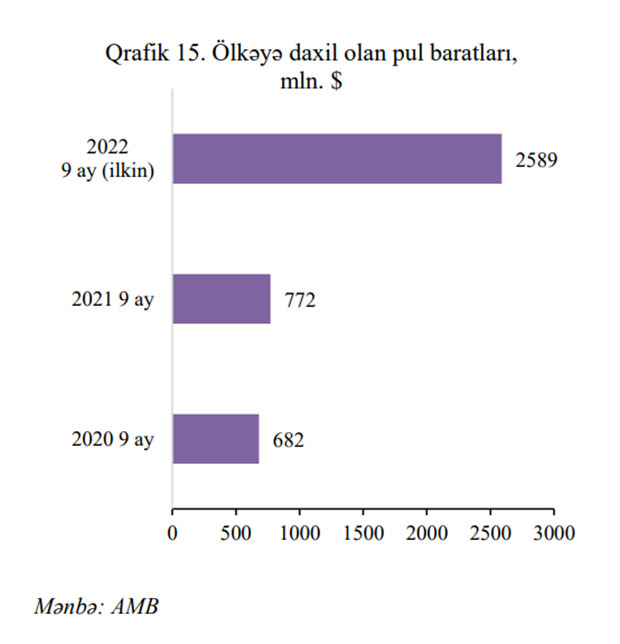 İlkin rəqəmlərə əsasən 2022-ci ilin 9 ayı ərzində Azərbaycana daxil olan pul baratları 2021-ci ilin müvafiq dövrü ilə müqayisədə təqribən 3,4 dəfə artaraq 2.6 milyard ABŞ dolları təşkil edib.