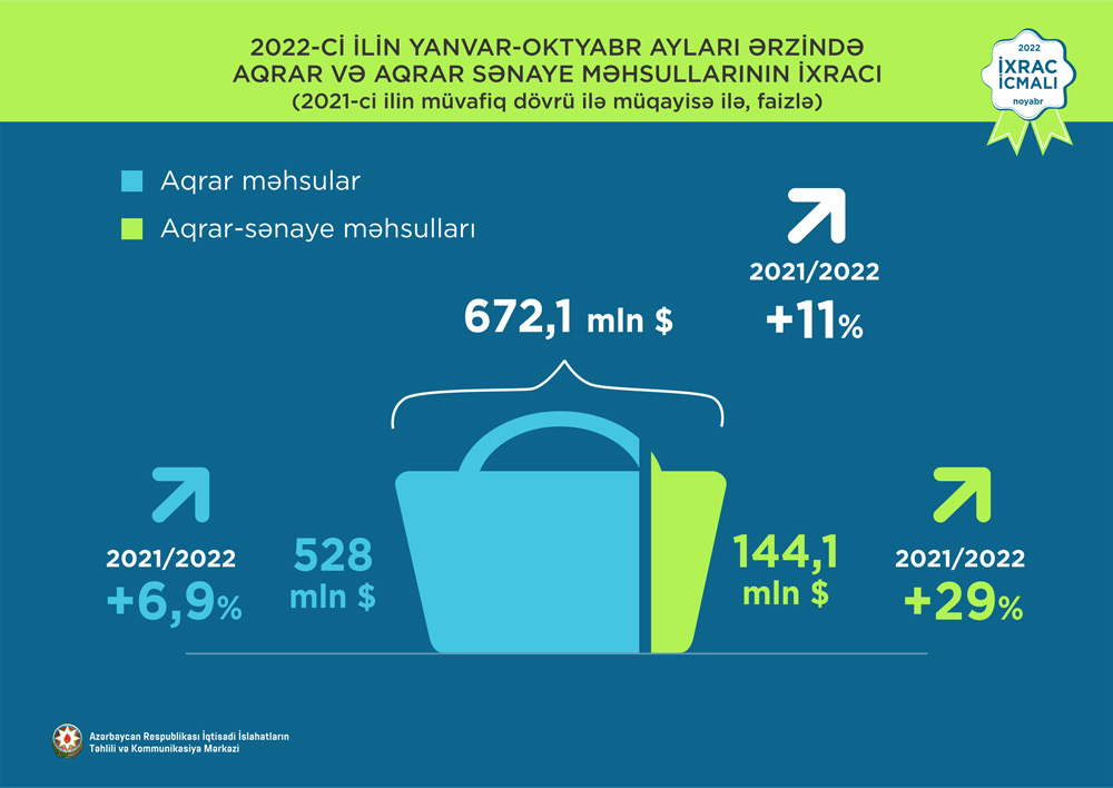 Aqrar və aqrar sənaye məhsulları üzrə birgə ixracın statistik dəyəri 672,1 milyon ABŞ dolları təşkil edib. 2022-ci ilin yanvar-oktyabr ayları ərzində ixrac edilən meyvə-tərəvəz məhsulları aqrar məhsullar qrupunun 92,5%-ini təşkil edib. Qeyri-neft-qaz ixracının tərkib hissəsində əhəmiyyətli yer tutan aqrar-sənaye məhsullarının yaratdığı əlavə dəyər ötən ilin müvafiq dövrü ilə müqayisədə 29% artıb.