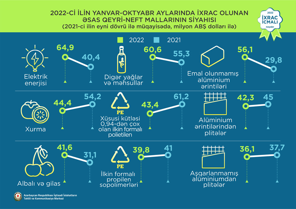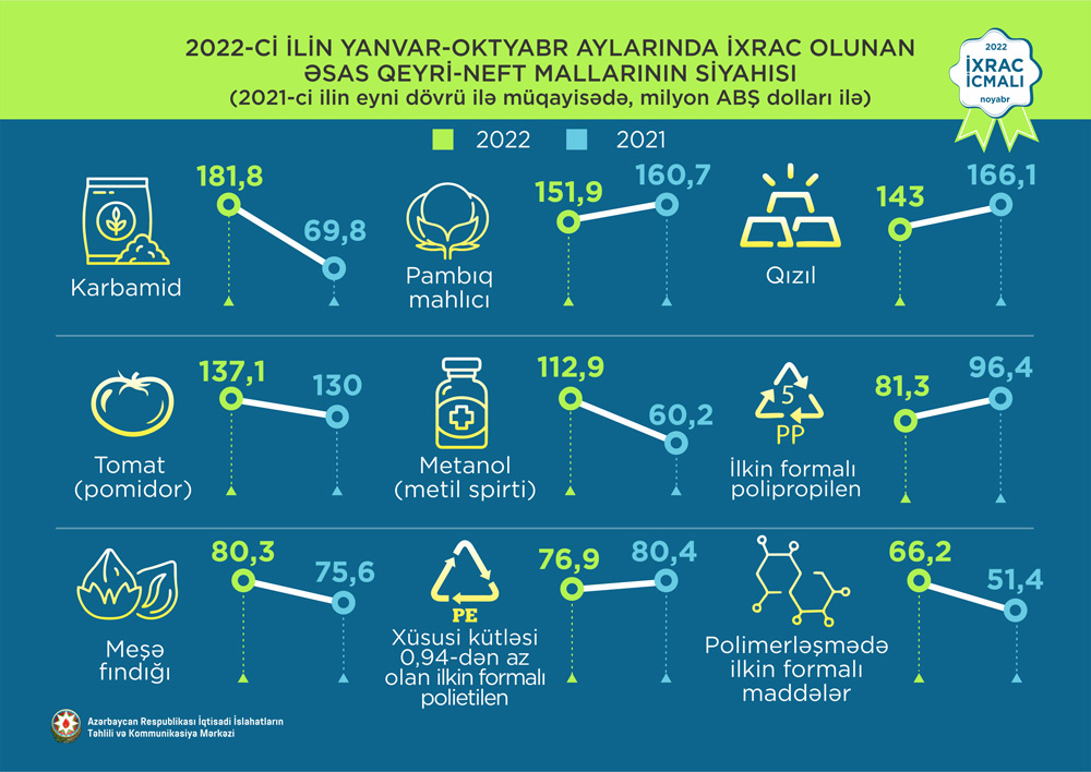 2022-ci ilin yanvar-oktyabr ayları ərzində ixrac edilən qeyri-neft sektoruna aid malların siyahısında karbamid (181,8 milyon ABŞ dolları) birinci olub. Bu siyahıda pambıq mahlıcı (151,9 milyon ABŞ dolları) ikinci, qızıl (143 milyon ABŞ dolları) isə üçüncü yerdə qərarlaşıb.