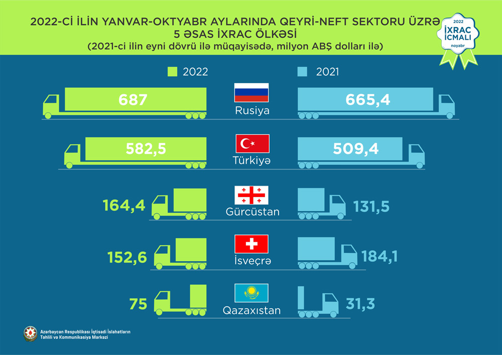 2022-ci ilin yanvar-oktyabr ayları ərzində Rusiya Federasiyasına 687 milyon ABŞ dolları, Türkiyəyə 582,5 milyon ABŞ dolları, Gürcüstana 164,4 milyon ABŞ dolları, İsveçrə Konfederasiyasına 152,6 milyon ABŞ dolları və Qazaxıstana isə 75 milyon ABŞ dolları dəyərində qeyri-neft sektoruna aid mal ixrac olunub.