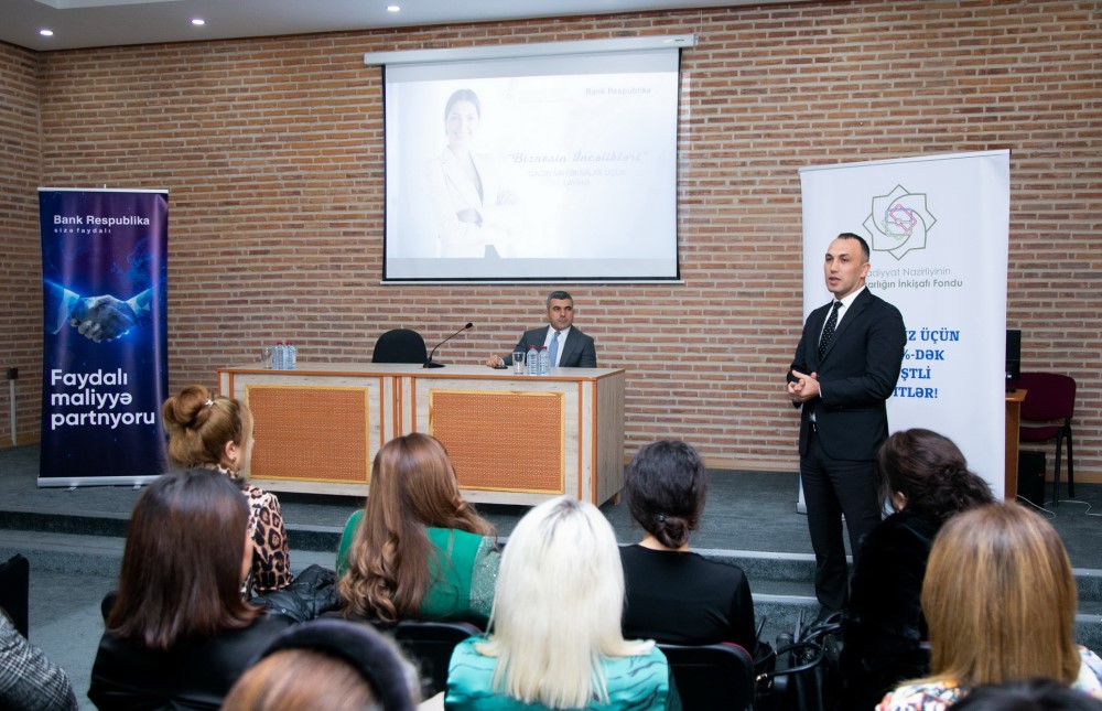 (®) İqtisadiyyat Nazirliyinin Sahibkarlığın İnkişafı Fondu və ölkənin aparıcı banklarından biri olan Bank Respublika, regionlarda fəaliyyət göstərən qadın sahibkarlar üçün birgə təşkil etdiyi “Biznesin incəlikləri” adlı layihəni uğurla başa vurub.