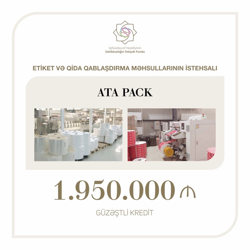 Sahibkarlığın İnkişafı Fondu tərəfindən "ATA PACK" MMC şirkətinə etiket və qida qablaşdırma məhsullarının istehsalı üçün 1 milyon 950 min manat güzəştli kredit ayrılıb.