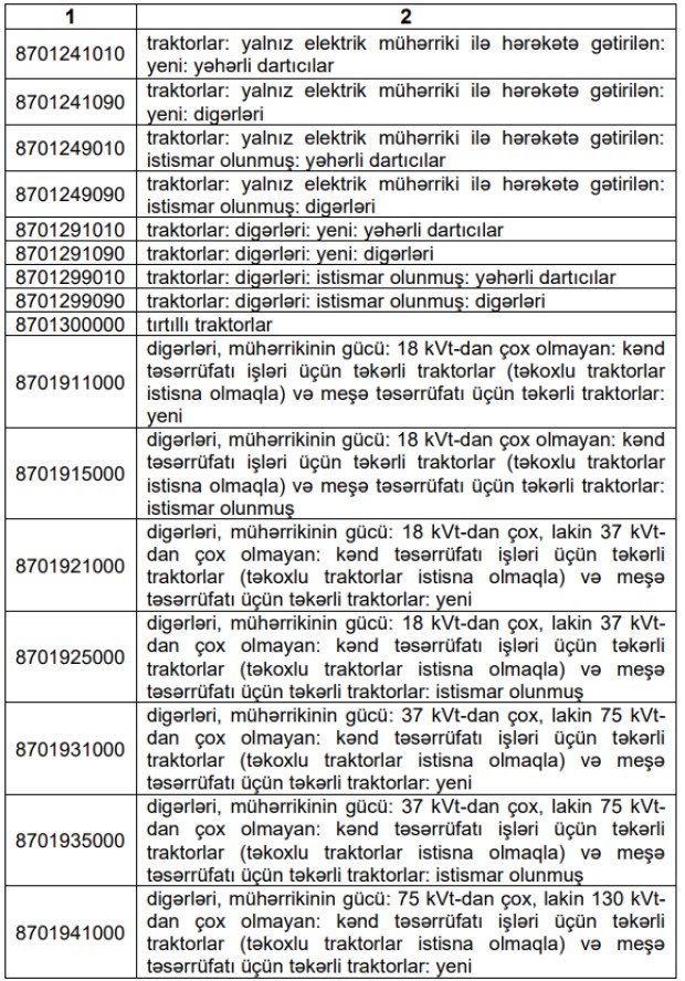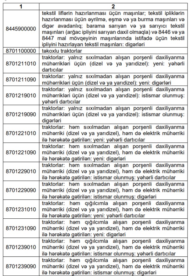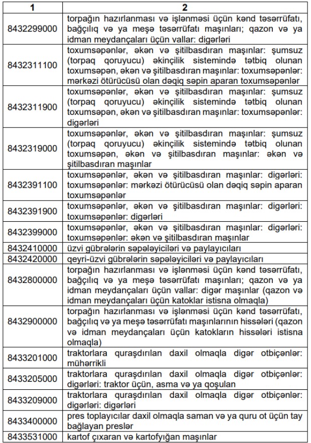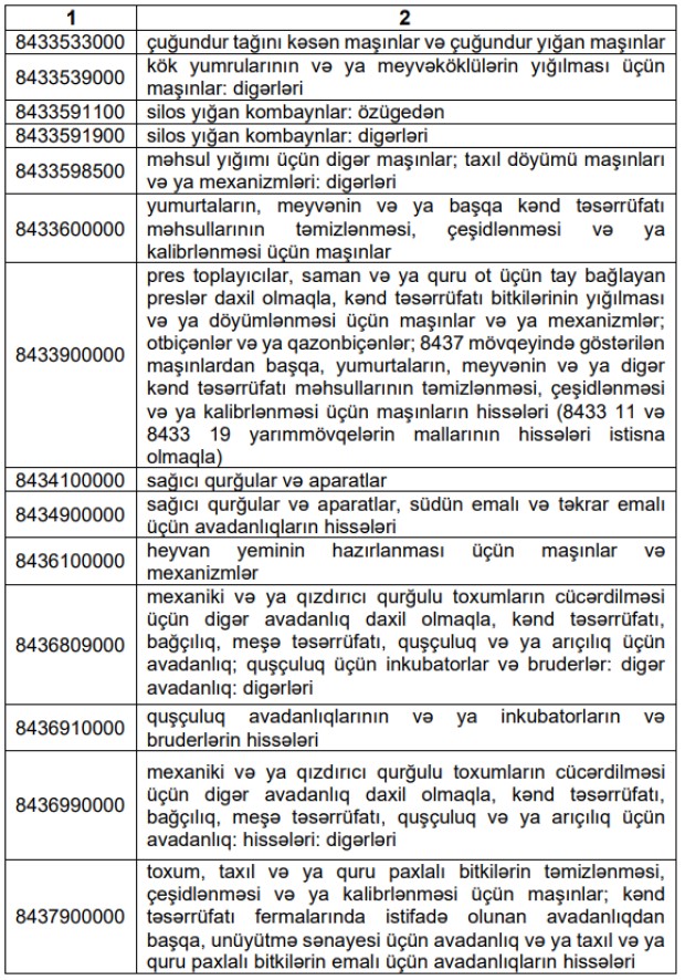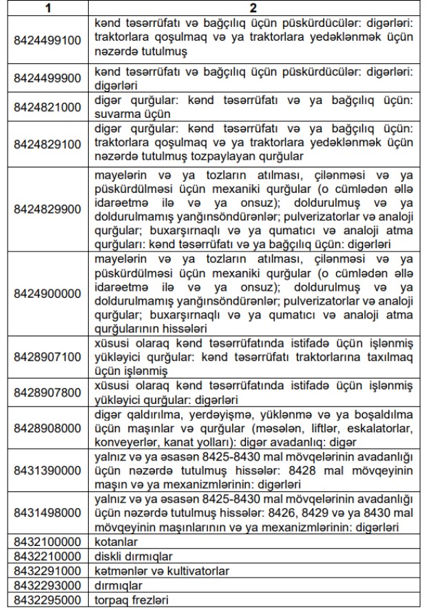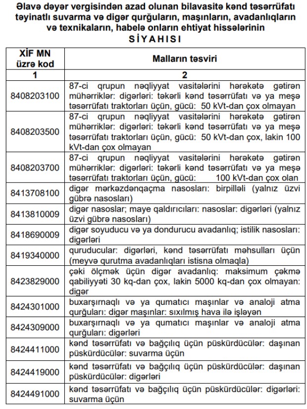 Nazirlər Kabineti “Əlavə dəyər vergisindən azad olunan bilavasitə kənd təsərrüfatı təyinatlı suvarma və digər qurğuların, maşınların, avadanlıqların və texnikaların, habelə onların ehtiyat hissələrinin Siyahısı” təsdiq edib.