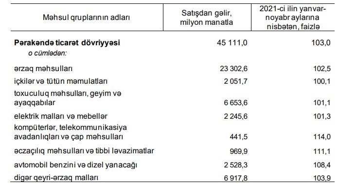 2022-ci ilin yanvar-noyabr aylarında pərakəndə ticarət şəbəkəsində istehlakçılara 45 milyard 111 milyon manatlıq, o cümlədən 25 milyard 354,3 milyon manatlıq ərzaq məhsulları, içkilər və tütün məmulatları, 19 milyard 756,7 milyon manatlıq qeyri-ərzaq malları satılmışdır.