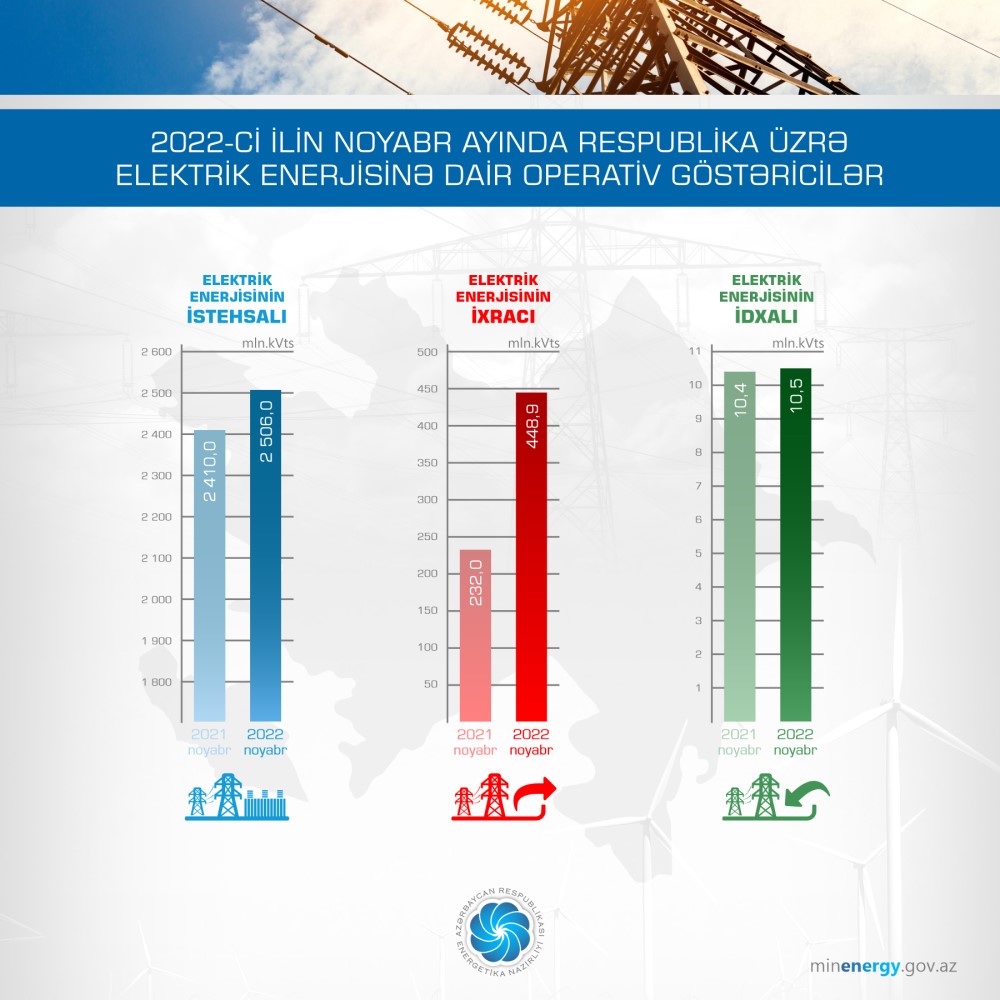 Elektrik enerjisinə dair operativ məlumatlara əsasən, 2022-ci ilin noyabr ayında Azərbaycanda elektrik enerjisinin istehsalı 2506,0 mln. kVt·st təşkil edib ki, bu da ötən ilin eyni dövrü ilə müqayisədə istehsalın 96,0 mln. kVt·st, yaxud 4,0 % artması deməkdir.