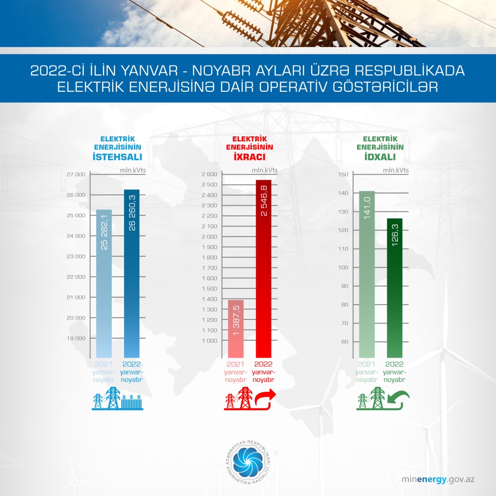 2022-ci ilin yanvar-noyabr ayları üzrə elektrik enerjisinin istehsalı “Azərenerji” ASC üzrə 23 696,7 mln. kVts (İES-lərdə 22 277,2 mln. kVt·st, SES-lərdə 1 419,5 mln. kVt·st), Naxçıvan MR Dövlət Energetika Xidməti üzrə 439,8 mln. kVt·st (İES-lərdə 285,8 mln. kVt·st, SES-lərdə 99,4 mln. kVt·st, GES-də 54,6 mln. kVt·st), “Azərişıq” ASC üzrə külək elektrik stansiyalarında 59,3 mln. kVt·st, müstəqil elektrik stansiyaları üzrə isə 2 064,5 mln. kVt·st təşkil edib.