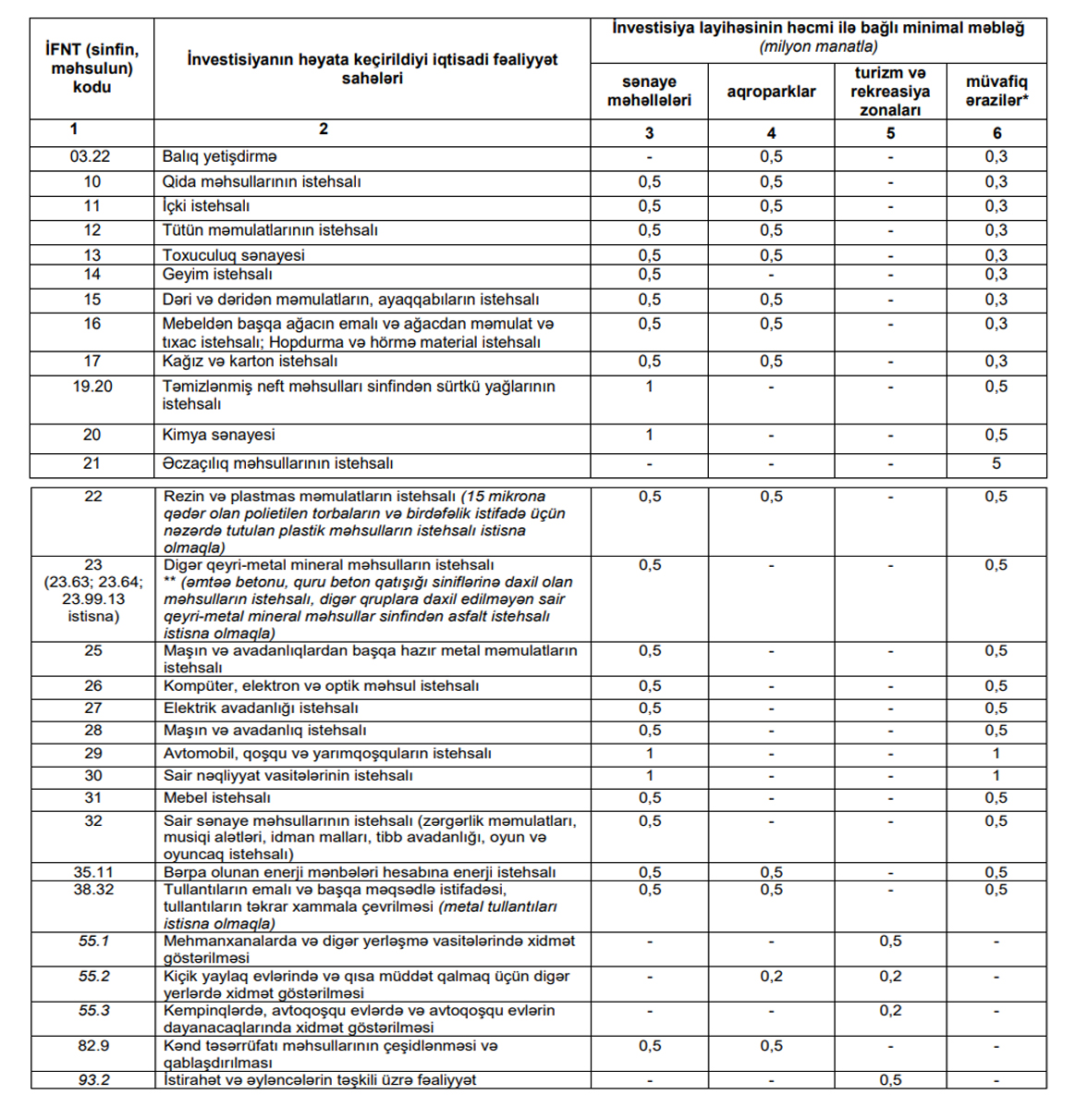 1. Sənaye məhəllələri, aqroparklar, turizm və rekreasiya zonaları müvafiq ərazilərdə yaradıldıqda investisiya layihəsinin həcmi ilə bağlı minimal məbləğ müvafiq olaraq sənaye məhəllələri, aqroparklar, turizm və rekreasiya zonalarına münasibətdə tətbiq edilən minimal məbləğ qədər hesablanır.