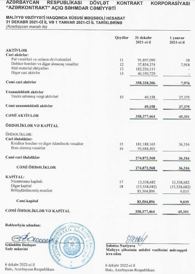 Azərbaycan Respublikası Dövlət Kontrakt Korporasiyası (“Azərkontrakt”ASC)2021-ci ili 83 milyon 496 min manat xalis mənfəət ilə başa vurub.