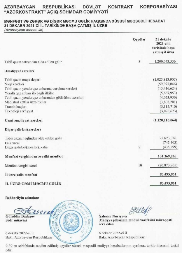 Marja.az “Azərkontrakt” Açıq Səhmdar Cəmiyyətinin 2021-ci il üzrə Maliyyə Hesabatları və Auditor Rəyi barədə məlumatlara xəbər verir ki, ötən il ASC-nin təbii qazın satışından əldə etdiyi gəlirlər 1 milyard 200 milyon manat, təbii qazın nəqlindən əldə etdiyi gəlirlər 25 milyon 623 min manat təşkil edib.