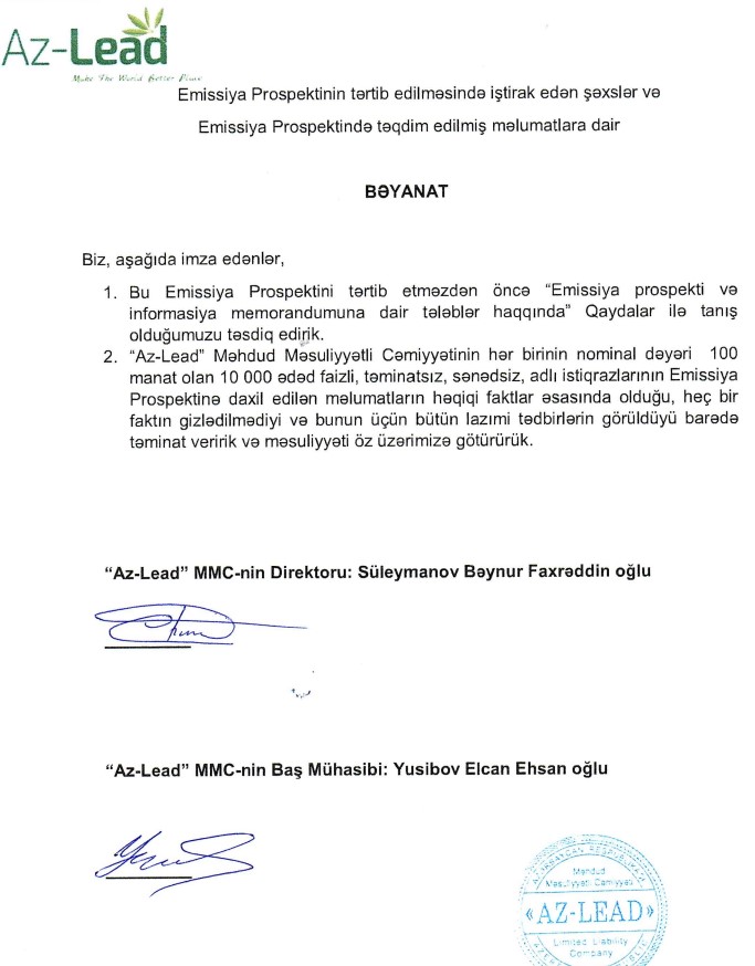 “Az-Lead” Məhdud Məsuliyyətli Cəmiyyəti hər birinin nominal dəyəri 100 manat olan 10 000 ədəd faizli, təminatsız, sənədsiz, adlı istiqrazlar emissiya edib.