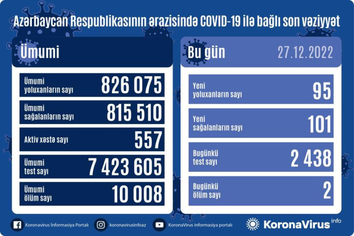 Azərbaycan Respublikasında koronavirus (COVID-19) infeksiyasına 95 yeni yoluxma faktı qeydə alınıb, 101 nəfər müalicə olunaraq sağalıb.
