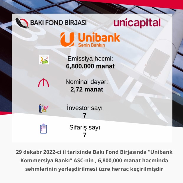29 dekabr 2022-ci il tarixində Bakı Fond Birjasında “Unibank Kommersiya Bankı” ASC-nin AZ1003002024 dövlət qeydiyyat nömrəli, 6,800,000 manat həcmində, adi adlı sənədsiz səhmlərinin abunə yazılışı üzrə yerləşdirilməsi yekunlaşıb.