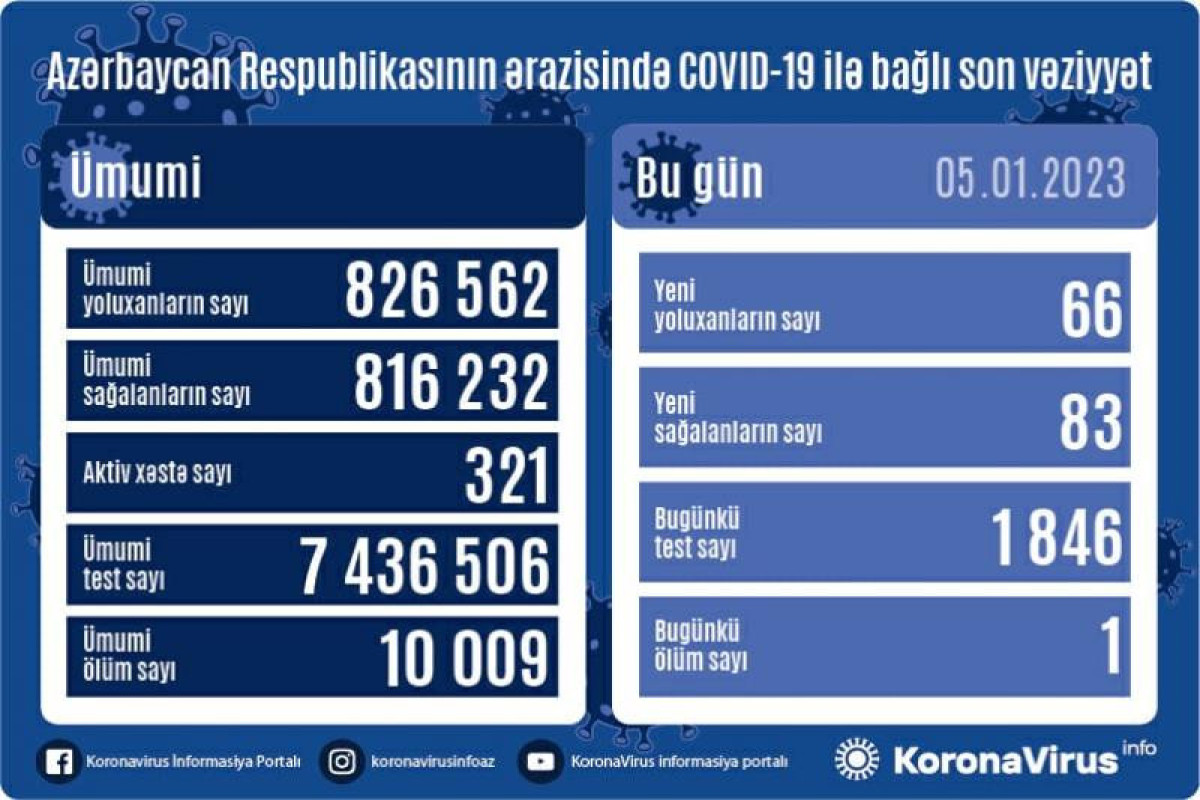 Azərbaycanda daha 66 nəfər COVID-19-a yoluxub, 1 nəfər vəfat edibAzərbaycan Respublikasında koronavirus (COVID-19) infeksiyasına 66 yeni yoluxma faktı qeydə alınıb, 83 nəfər müalicə olunaraq sağalıb.