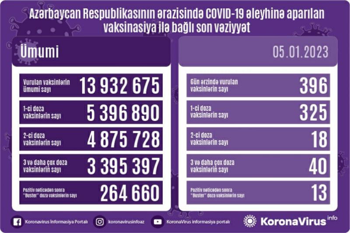 Vurulan vaksinlərin ümumi sayı 13 932 675, birinci mərhələ üzrə vaksinasiya olunanların ümumi sayı 5 396 890, ikinci mərhələ üzrə vaksinasiya olunanların sayı 4 875 728, üç və daha çox doza üzrə vaksinasiya olunanların sayı 3 395 397, pozitiv nəticədən sonra buster doza üzrə vaksinasiya olunanların sayı isə 264 660 nəfər təşkil edir.