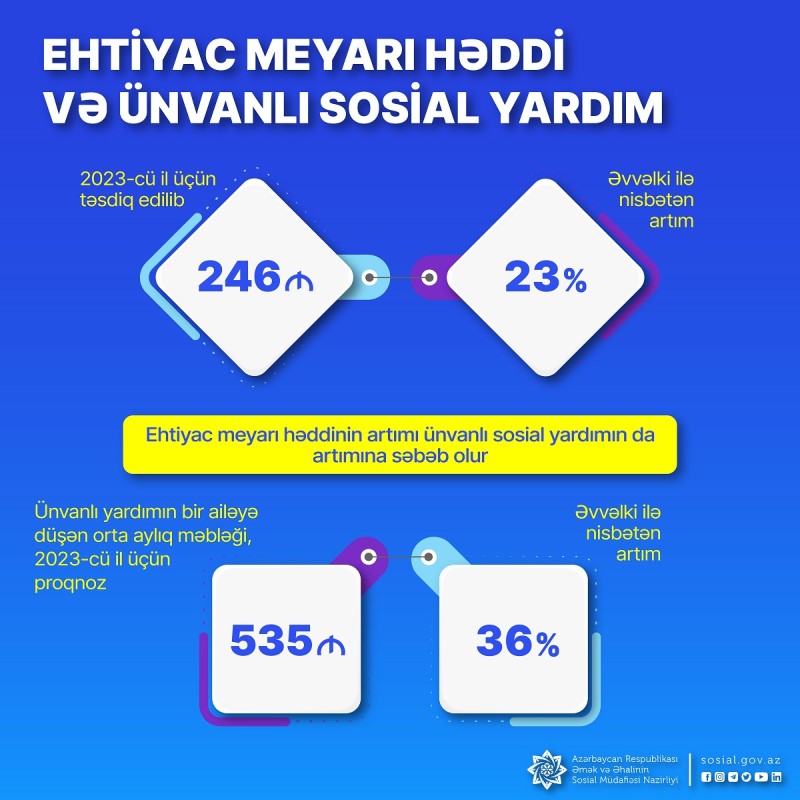 2023-cü il üçün ehtiyac meyarının həddi ötən ilə nisbətən 23 faiz artırılmaqla 246 manat müəyyən olunub ki, bu artımla ünvanlı yardımların da məbləği artacaq.