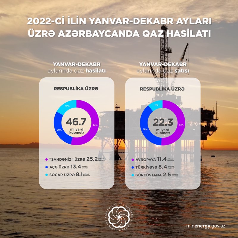 Energetika Nazirliyinin yaydığı məlumata görə, 2022-ci ilin yanvar-dekabr ayları üzrə operativ məlumatlara əsasən, ötən il ərzində Azərbaycanda 46,7 milyard kubmetr təbii qaz hasil edilib. Qazın 13,4 milyard kubmetri “Azəri-Çıraq-Günəşli”dən, 25,2 milyard kubmetri “Şahdəniz”dən, 8,1 milyard kubmetri SOCAR üzrə hasil olunub. 2021-ci ilə nisbətən 6,5 faiz, yəni 2,9 milyard kubmetr artımla qaz hasil edilib.