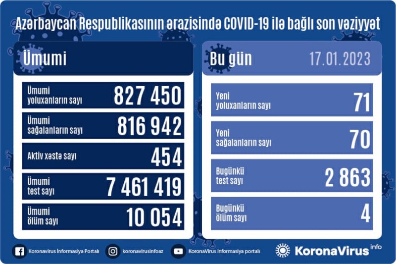 Azərbaycan Respublikasında koronavirus (COVID-19) infeksiyasına 71 yeni yoluxma faktı qeydə alınıb, 70 nəfər müalicə olunaraq sağalıb.