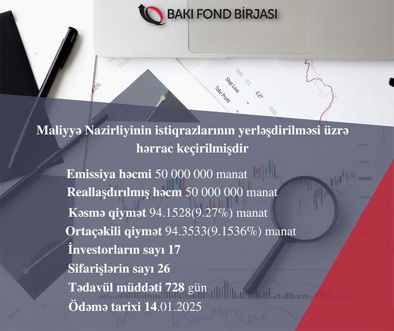 17 yanvar 2023-cü il tarixində Bakı Fond Birjasında Azərbaycan Respublikası Maliyyə Nazirliyinin AZ0201040018 ISIN-li, 50 milyon manat həcmində, 728 gün tədavül müddətli dövlət ortamüddətli istiqrazlarının (DOİ) yerləşdirilməsi üzrə hərrac keçirilib.