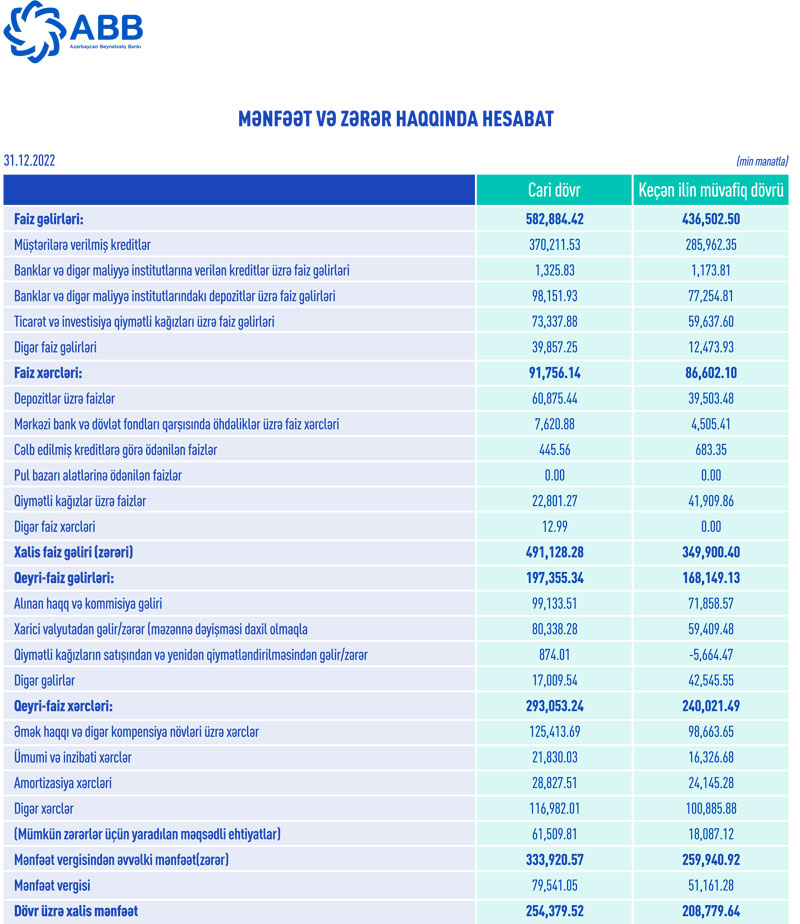 Əsasən dövlətə məxsus “ABB” ASC (Azərbaycan Beynəlxalq Bankı) 2022-ci il üzrə maliyyə göstəricilərini açıqlayıb.