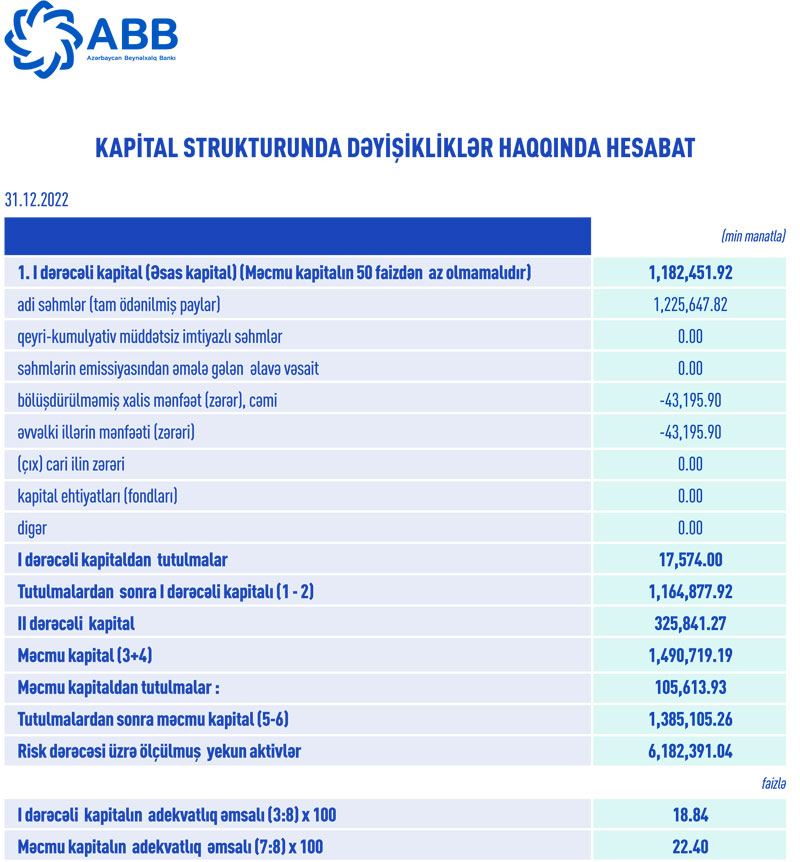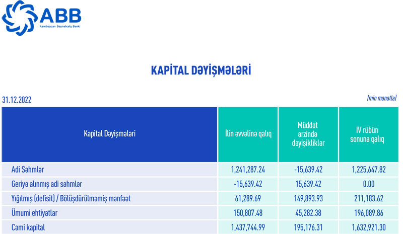 31 dekabr 2022-ci il tarixində ABB 1 milyard 385 milyon 105 min manat məcmu kapitala malik olub. 31 dekabr 2021-ci il tarixində Bank 1 milyard 214 milyon 32 min manat məcmu kapitala malik idi.