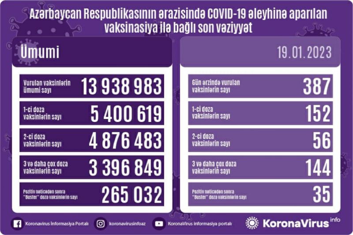 Vurulan vaksinlərin ümumi sayı 13 938 983, birinci mərhələ üzrə vaksinasiya olunanların ümumi sayı 5 400 619, ikinci mərhələ üzrə vaksinasiya olunanların sayı 4 876 483, üç və daha çox doza üzrə vaksinasiya olunanların sayı 3 396 849, pozitiv nəticədən sonra buster doza üzrə vaksinasiya olunanların sayı isə 265 032 nəfər təşkil edir.
