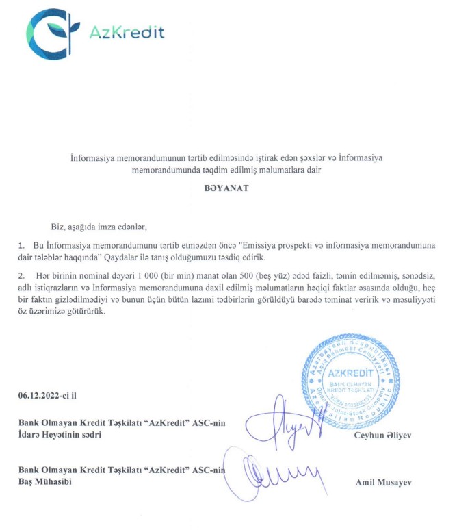 Bank olmayan kredit təşkilatı "AzKredit" ASC 500 min manatlıq istiqraz buraxır.