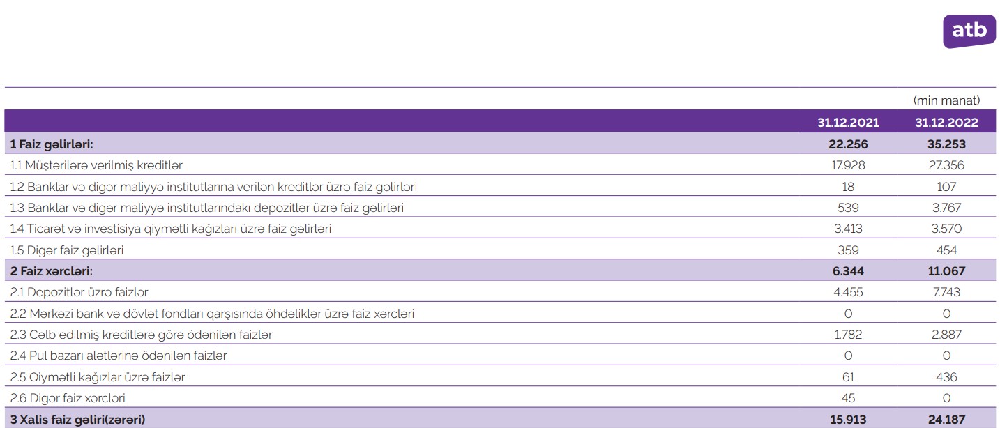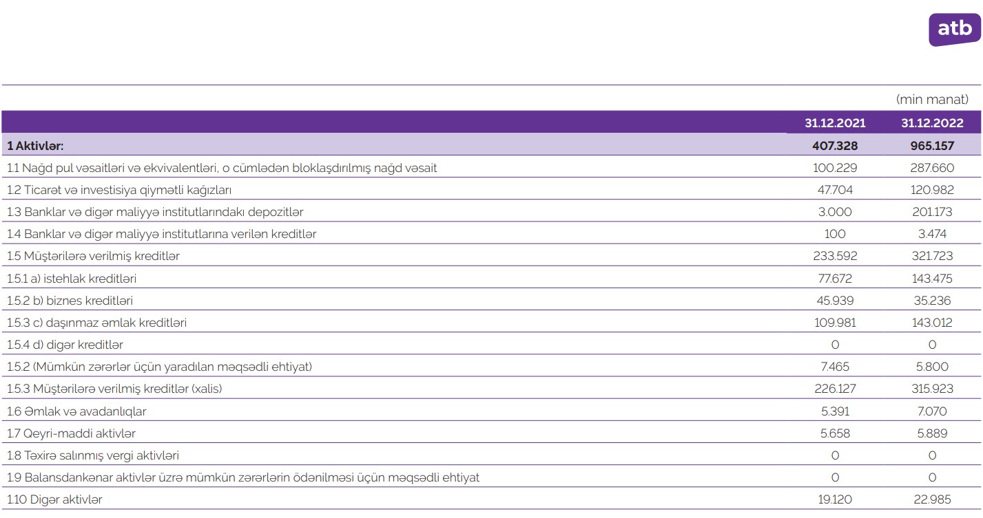 Dövlət bankı "Azər Türk Bank" ASC (ATB) 2022-ci il üzrə maliyyə göstəricilərini açıqlayıb.
