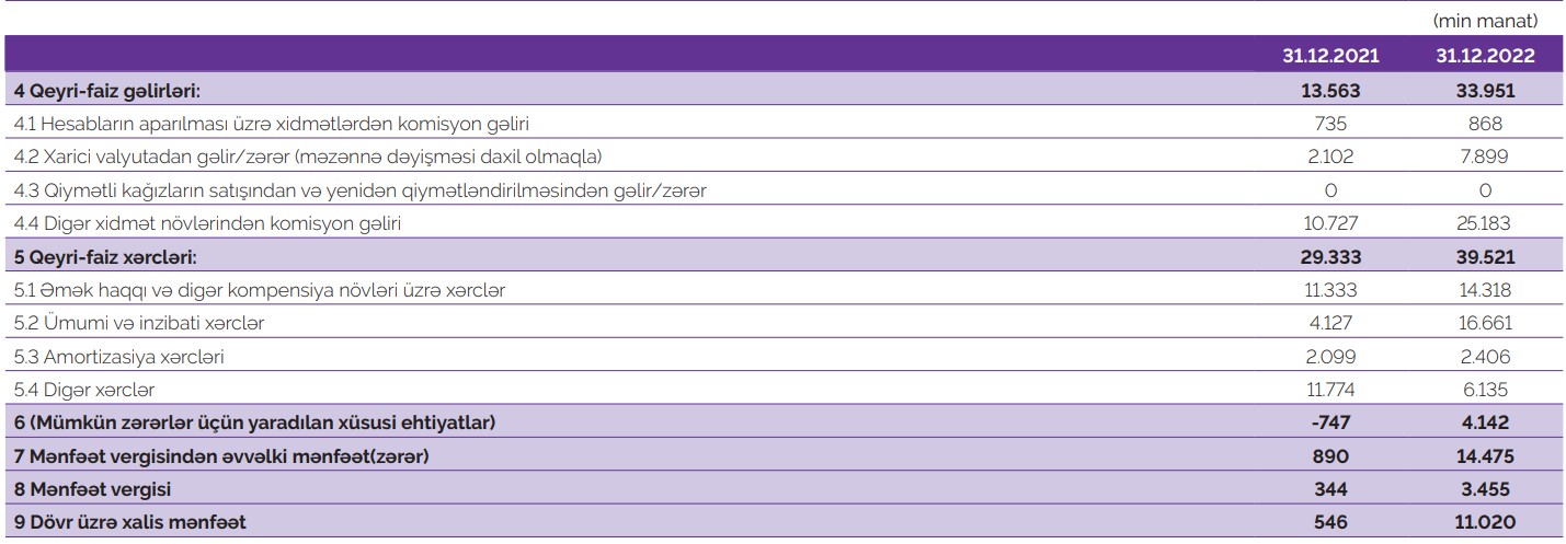 Bankın müştərilərə verilmiş kreditlərdən gəliri, hesabların aparılması üzrə xidmətlərdən komisyon gəliri, xarici valyutadan gəliri (məzənnə dəyişməsi daxil olmaqla) və digər xidmət növlərindən komisyon gəliri artıb.