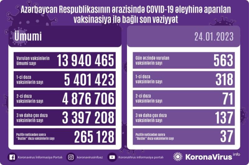 Azərbaycanda son sutkada koronavirus (COVID-19) əleyhinə 563 vaksin vurulub. Bir gündə birinci mərhələ üzrə vaksinasiya olunanların sayı 318, ikinci mərhələ üzrə vaksinasiya olunanların sayı 71, üç və daha çox doza üzrə vaksinasiya olunanların sayı 137, pozitiv nəticədən sonra buster doza üzrə vaksinasiya olunanların sayı 37 nəfərdir.