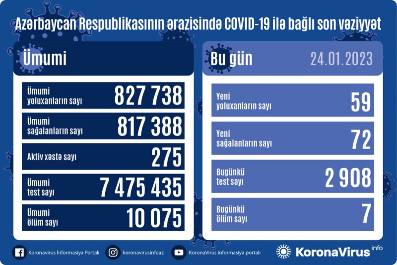 Azərbaycan Respublikasında koronavirus (COVID-19) infeksiyasına 59 yeni yoluxma faktı qeydə alınıb, 72 nəfər müalicə olunaraq sağalıb.