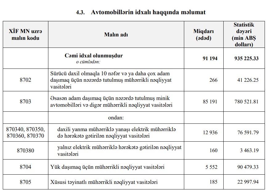 2021-ci ildə Azərbaycana 935 milyon 225 min dollar dəyərində 91 min 194 ədəd avtomobil idxal edilmişdi.