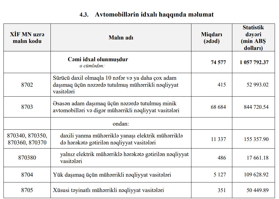 Ötən il 844 milyon 720 min dollar dəyərində 68 min 684 ədəd minik avtomobilləri gətirilib 2021-ci ildə 780 milyon 522 min dollar dəyərində 85 min 191 ədəd minik avtomobili gətirilmişdi.